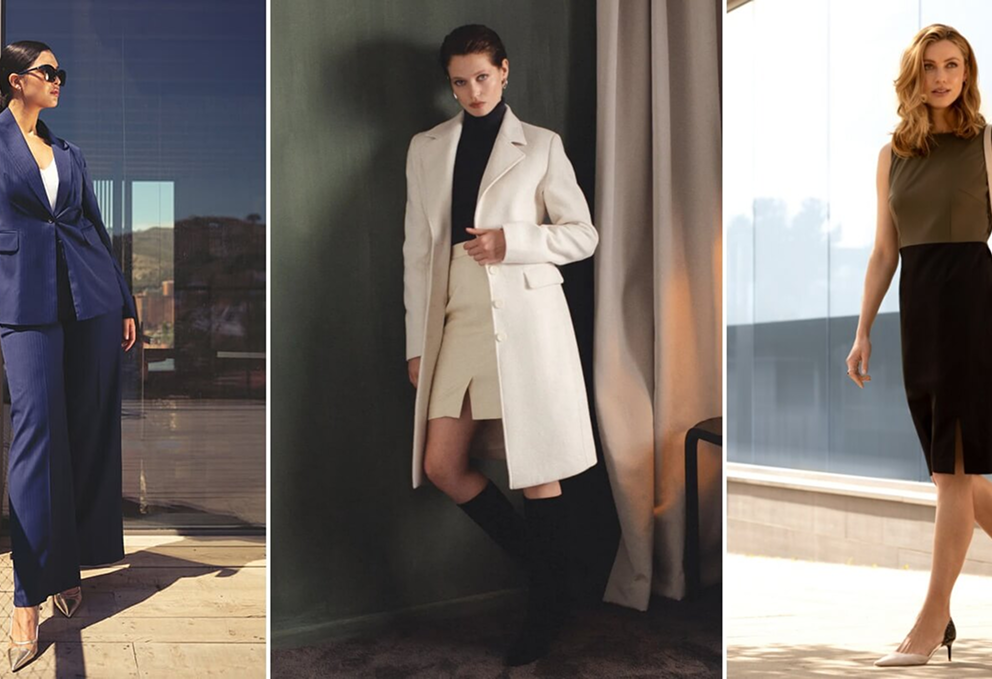 Code business casual : pantalons droits, chemises ou blouses simples, pulls légers et accessoires discrets.